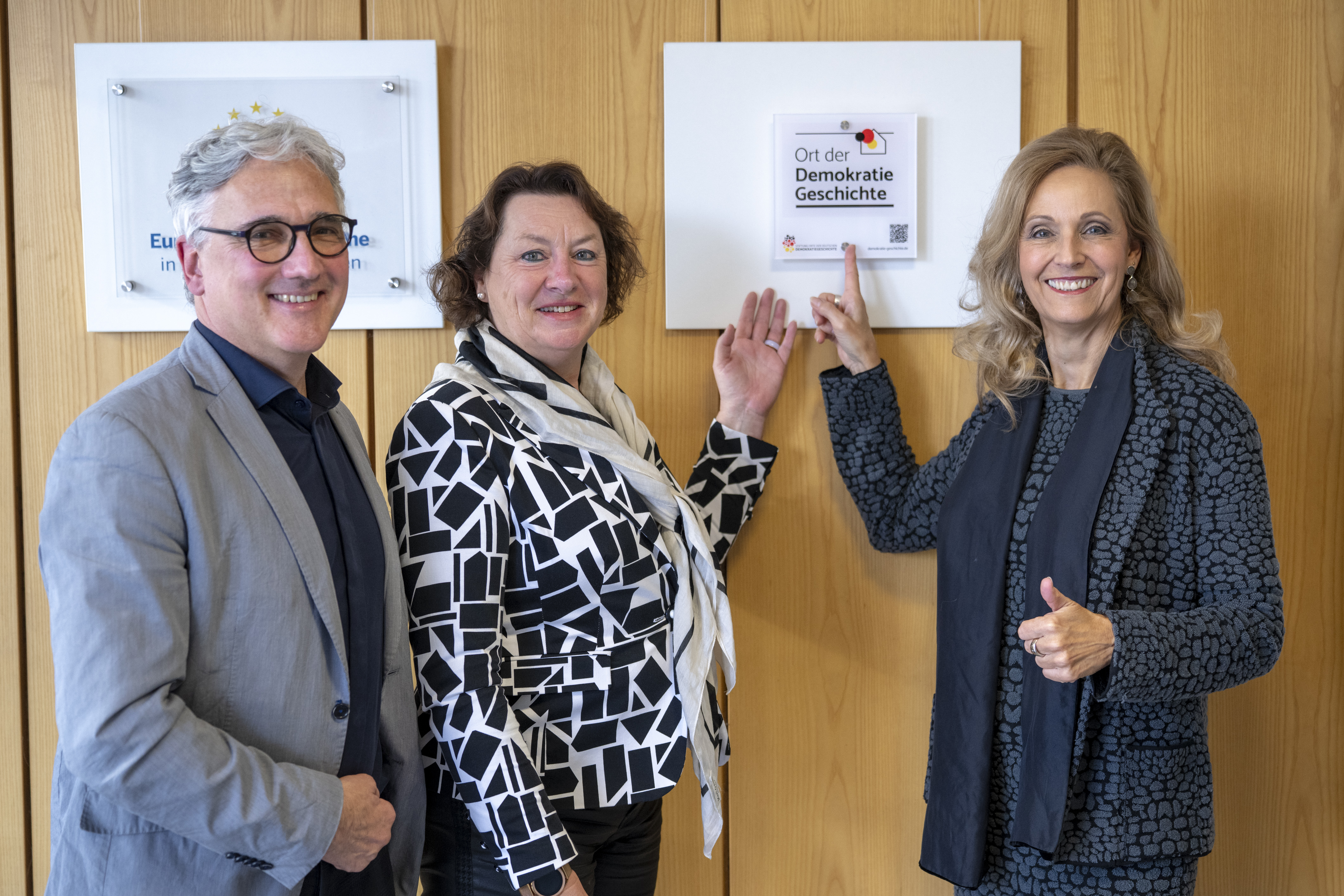 Dr. Kai-Michael Sprenger, Direktor der Stiftung Orte der deutschen Demokratiegeschichte, Anne Henk-Hollstein, Vorsitzende des Landschaftsausschusses und LVR-Direktorin Ulrike Lubek (v.l.n.r.) vor der Plakette "Ort der Demokratiegeschichte".