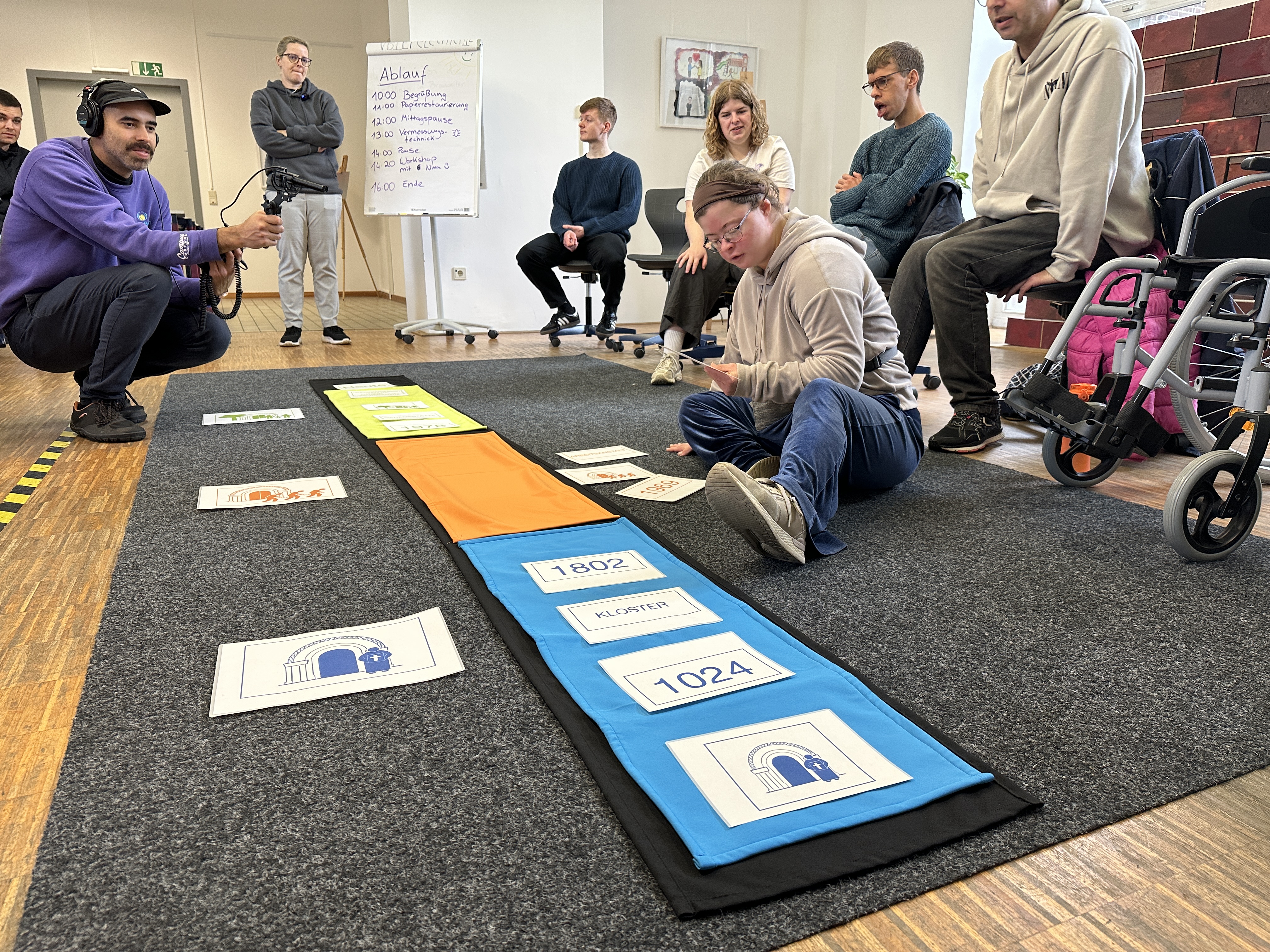 Nachdenken über die Vergangenheit ist unmittelbar verknüpft mit der Archivierung der deutschen Geschichte. Dazu bekamen die Podcaster*innen am Donnerstag, 16. Oktober, Einblicke in die Restaurierung zeithistorischer Dokumente in der Papierrestaurierung des LVR-Archivberatungs- und Fortbildungszentrums. Danach veranschaulichten Kolleg*innen des LVR-Amts für Denkmalpflege, wie Denkmäler mithilfe von Drohnenaufnahmen für die Zukunft digital archiviert werden. Abgerundet wurde der Tag mit einem zweistündigen Workshop in der Gedenkstätte Brauweiler des LVR, in dem die Gruppe eigene Themen und Fragen zur NS-Zeit erarbeiteten. Die Interessierten lernten die Biografien von Gefangenen der NS-Diktatur in der Arbeitsanstalt Brauweiler kennen. Dafür verwendeten sie einen inklusiven Zeitstrahl, Originalquellen, Piktogramme und den Media-Guide in Leichter Sprache.