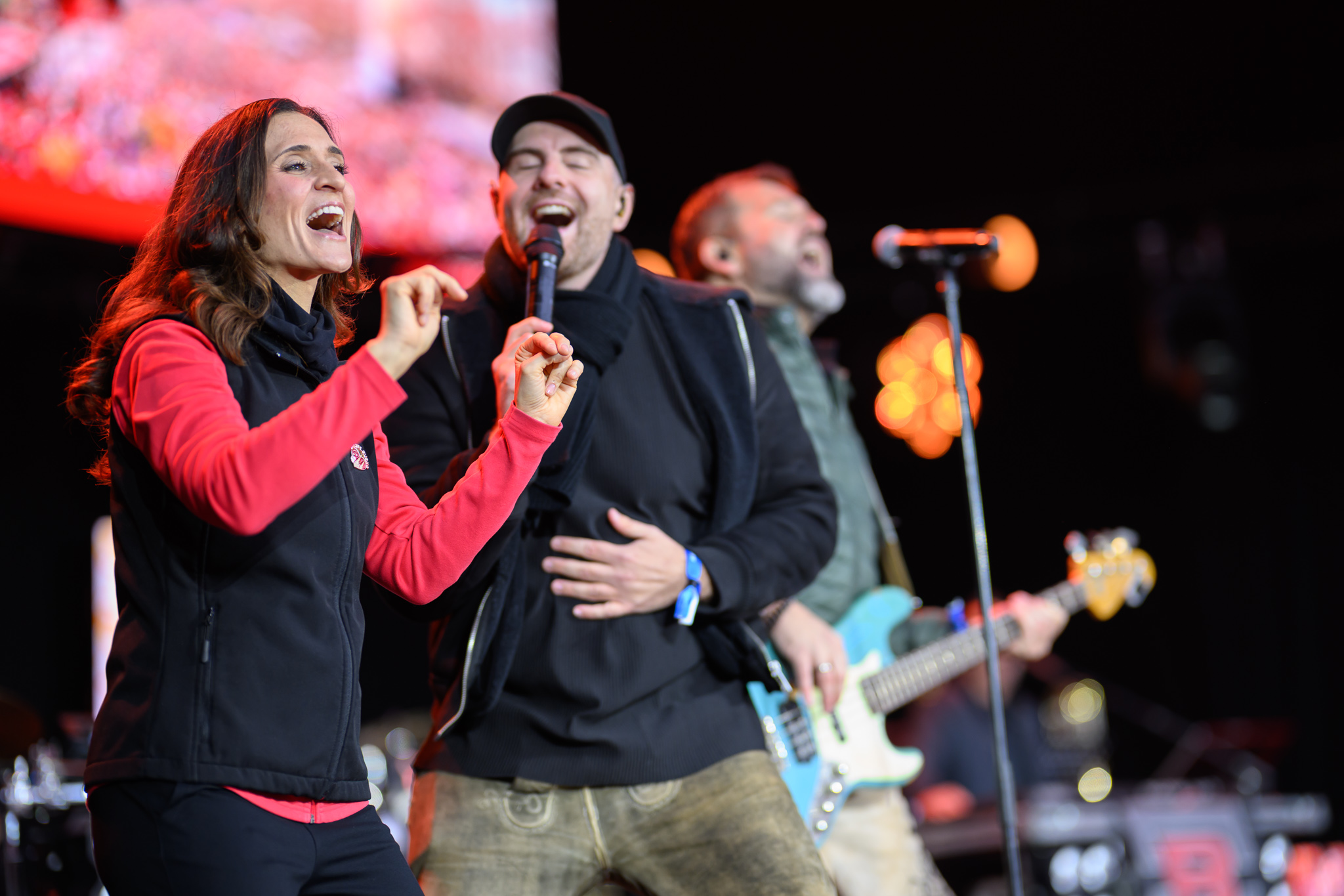Aline Ackers (links) gebärdet die gesungenen Lieder op Kölsch und lädt alle zum Mitschunkeln ein.