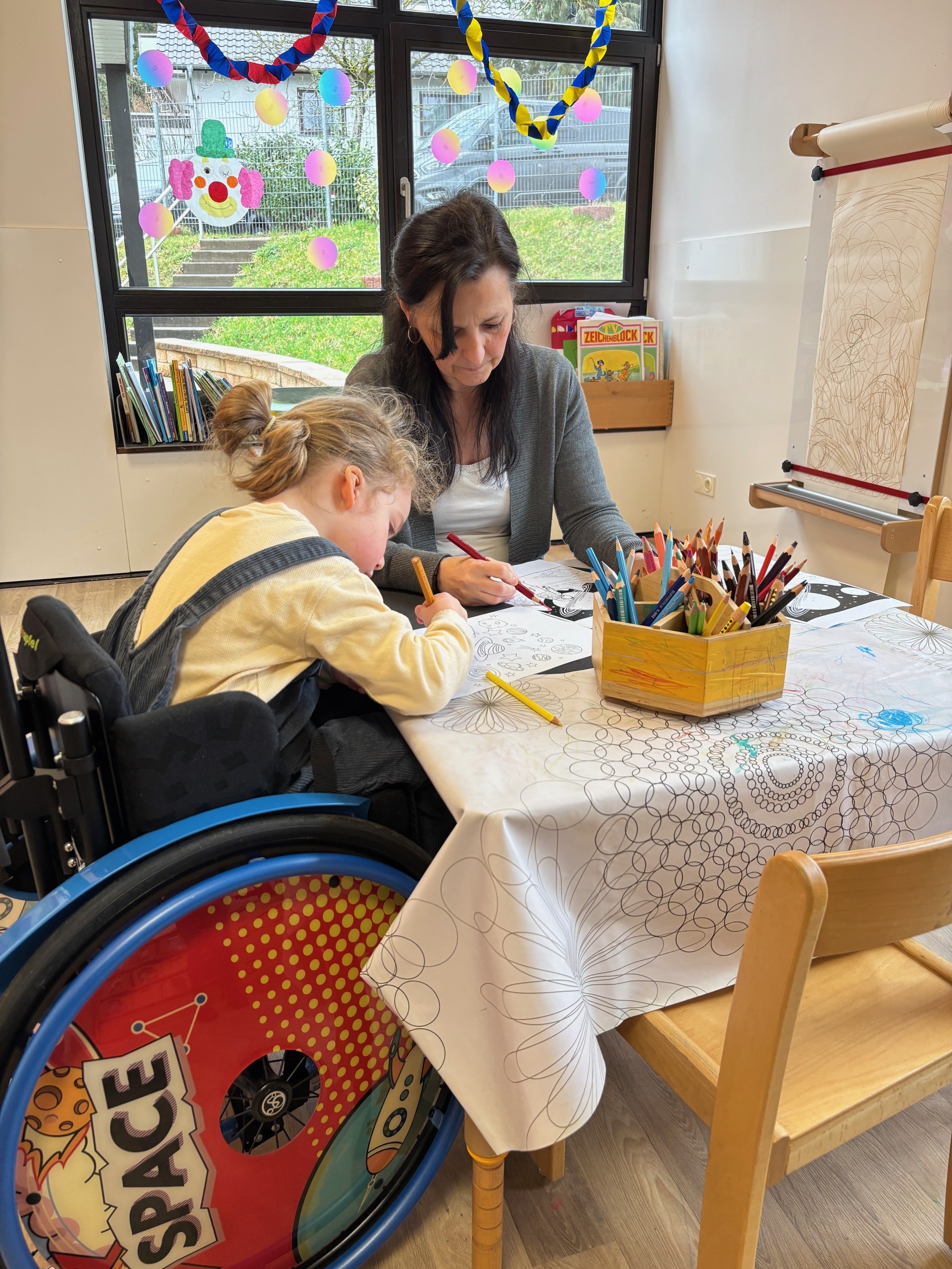 Siegburg. 15. April 2026. Das Weltall ist für Jonte das Größte – das erkennt man schon an den Radkappen seines Rollstuhls, auf denen große Raketen zu sehen sind. Vielleicht ist er auch deshalb so konzentriert beim Ausmalen der Planeten und Sterne am Basteltisch in der Siegburger Kita „Kinderburg Veronika Keller“.