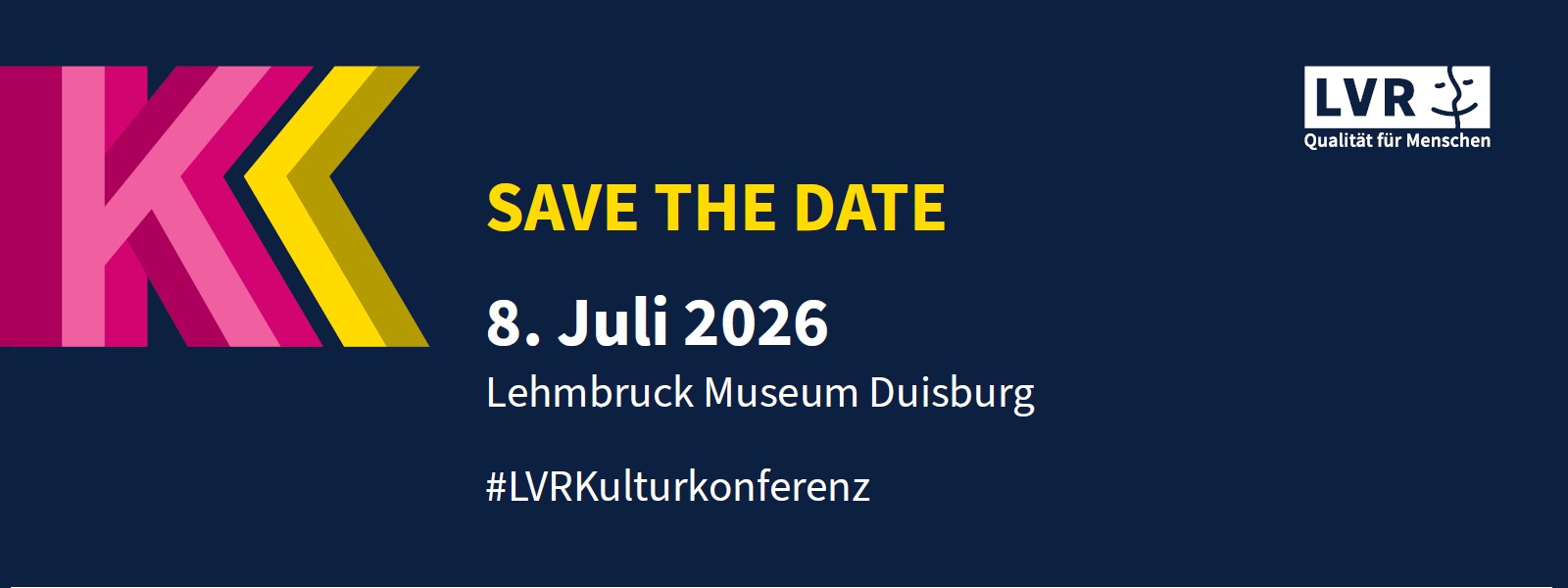 Die LVR-Kulturkonferenz 2026 wird am Mittwoch, den 8. Juli 2026 im Lehmbruck Museum in Duisburg stattfinden. Informationen zu Programm und Anmeldung werden zeitnah auf unserer Webseite veröffentlicht.