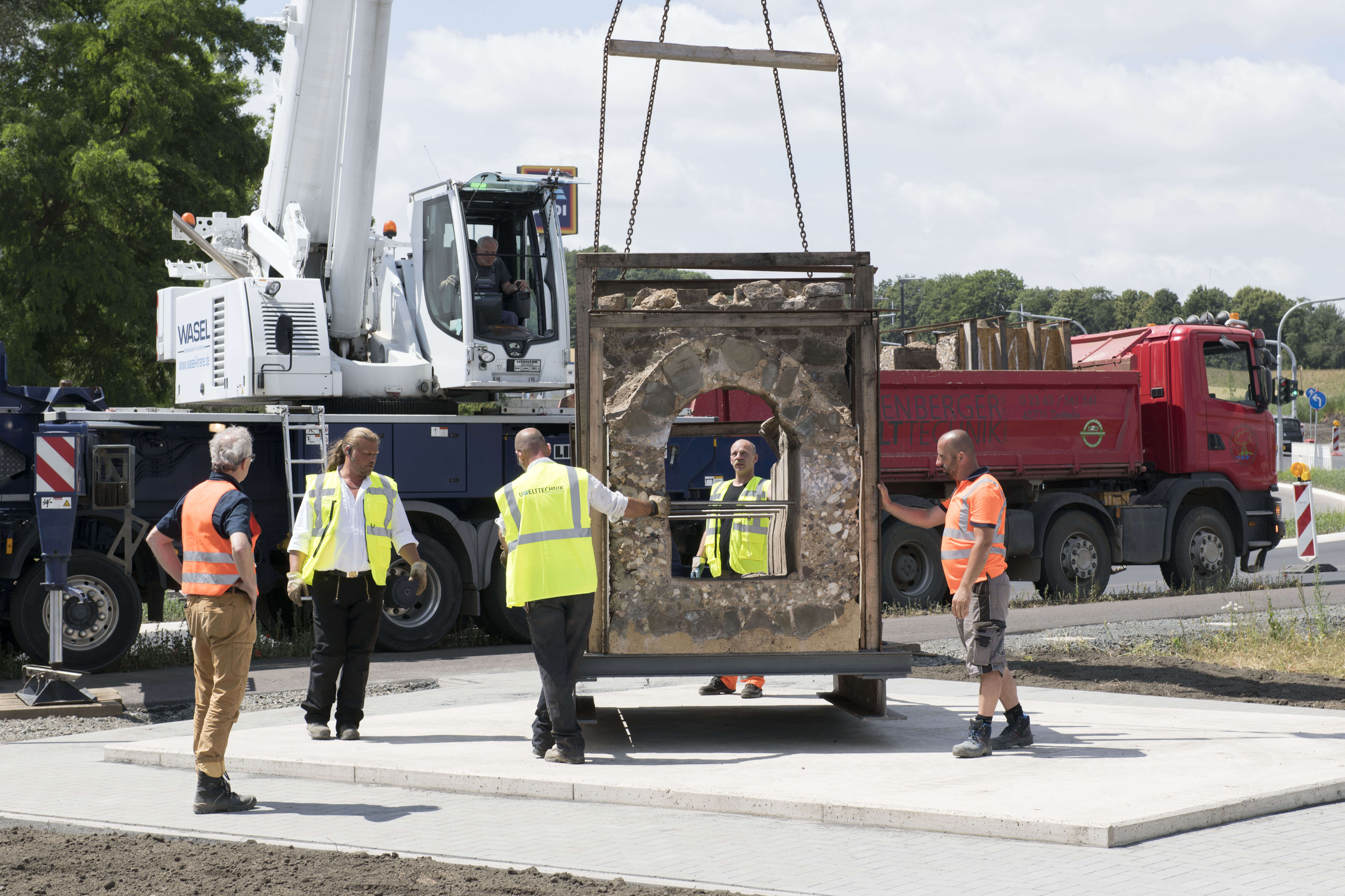 Hürth-Hermülheim. 2. Juli 2019. In einer aufwändigen Aktion sind sechs Teilstücke der römischen Eifelwasserleitung an ihren Fundort Hürth-Hermülheim zurückgekehrt. Die römische Wasserleitung musste dem Bau einer neuen Umgehungsstraße weichen. Per Schwertransport und Kran sind die bis zu elf Tonnen schweren „Römerkanal“-Stücke an ihren Originalfundplatz an der neuen Bundesstraße B 256 n zurückgebracht worden.
